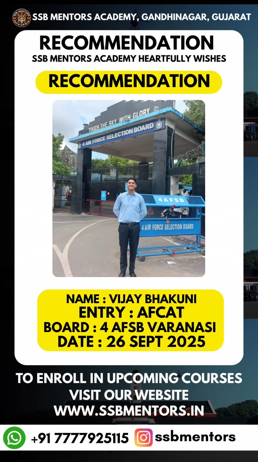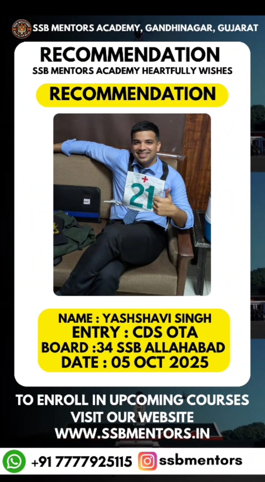 The SSB Mentors @ Gandhinagar has recently launched SSB Preparatory Classes with a renewed passion and dedication to equip defense aspirants for their upcoming SSB Interviews. These classes adopt a unique approach that emphasizes on developing individual personalities rather than relying on traditional rote learning methods commonly used by other SSB Interview Coaching Institutes.