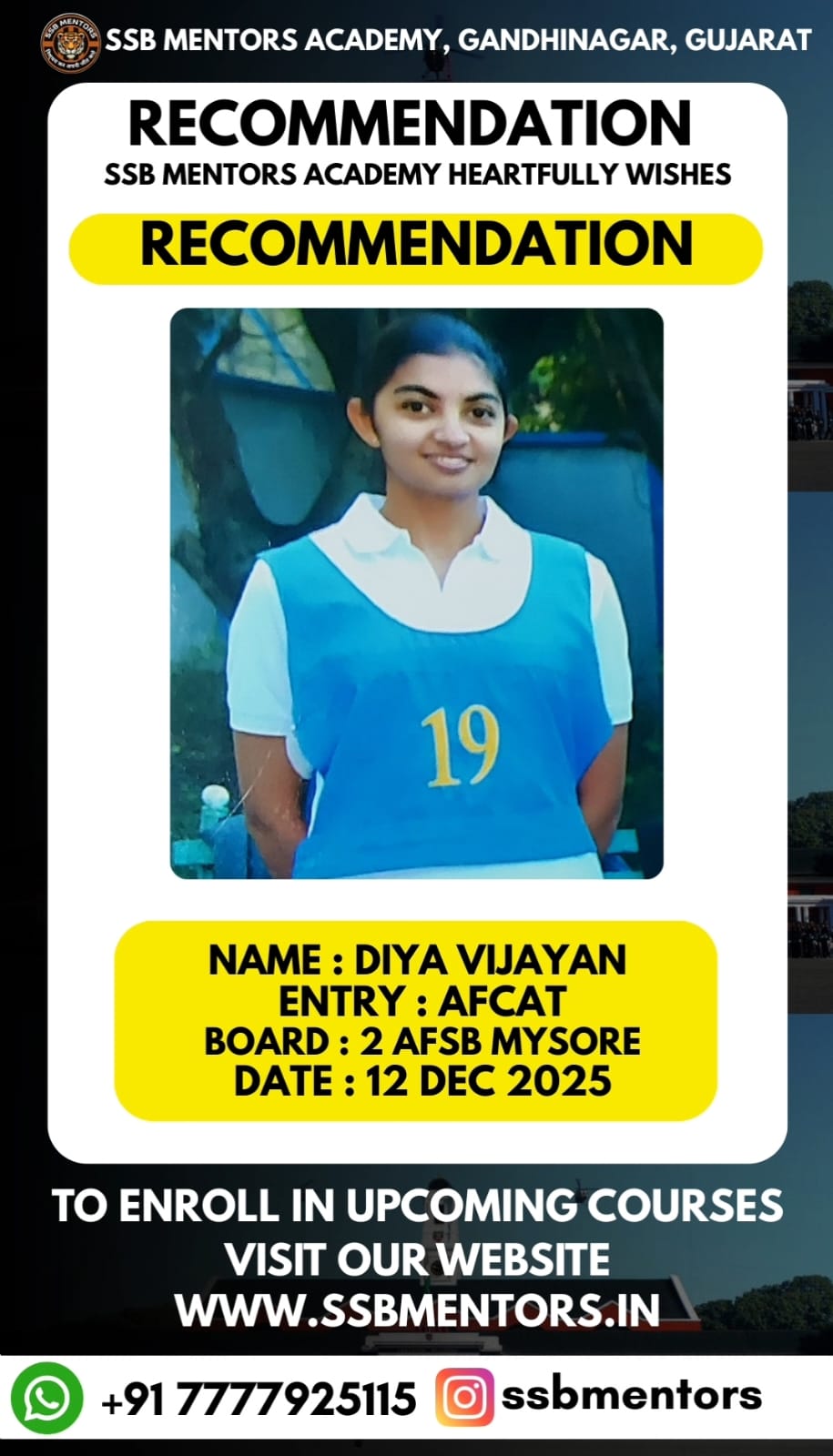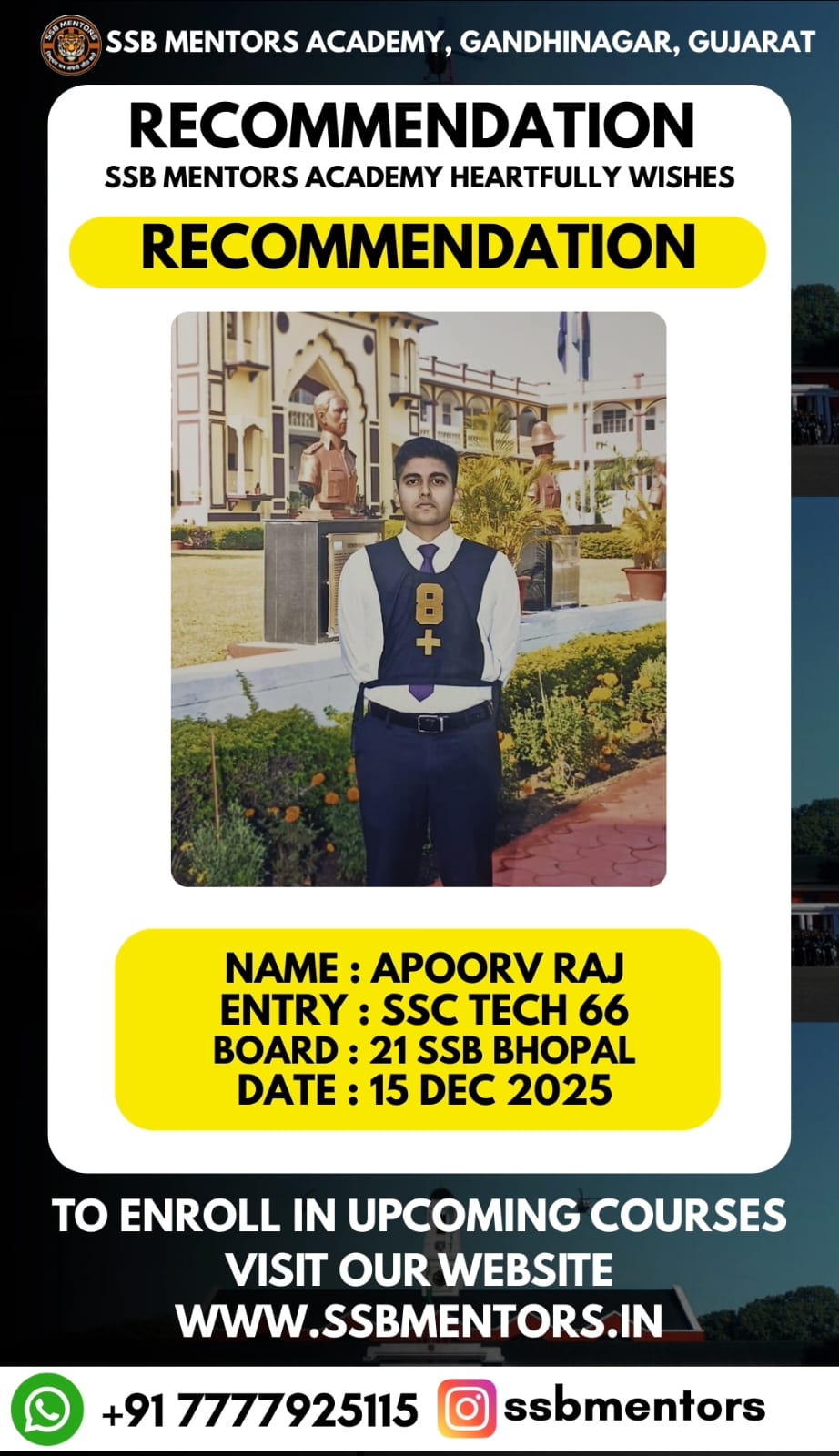 The SSB Mentors @ Gandhinagar has recently launched SSB Preparatory Classes with a renewed passion and dedication to equip defense aspirants for their upcoming SSB Interviews. These classes adopt a unique approach that emphasizes on developing individual personalities rather than relying on traditional rote learning methods commonly used by other SSB Interview Coaching Institutes.